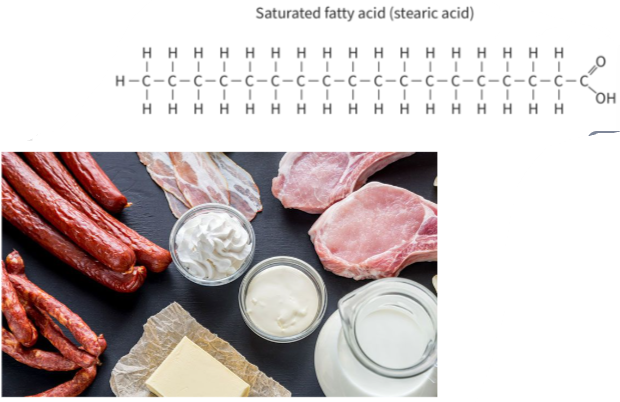 | Saturated | Animal fats, butter, coconut oil | Energy storage in warm-blooded animals |