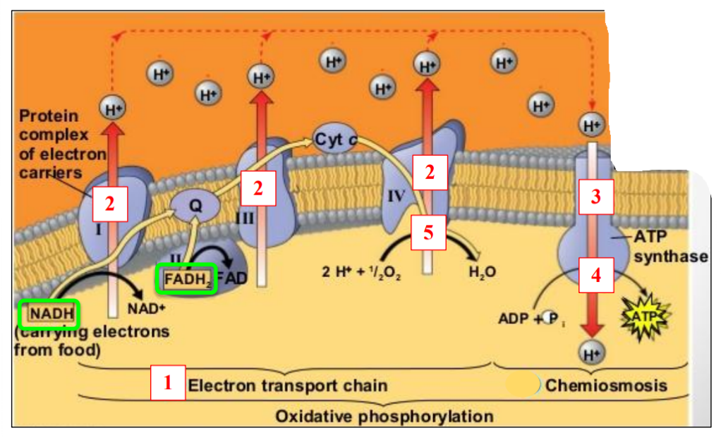 – Electrons from NADH and FADH₂ flow through the electron transport chain (ETC).