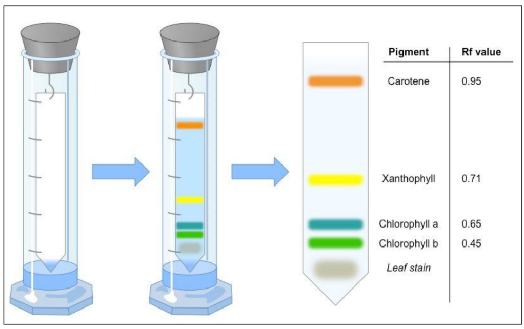 Each pigment has a characteristic Rf value (in a specific solvent), allowing identification.