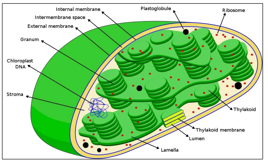 Chlorophyll (in chloroplasts) absorbs light energy, especially red and blue wavelengths.
