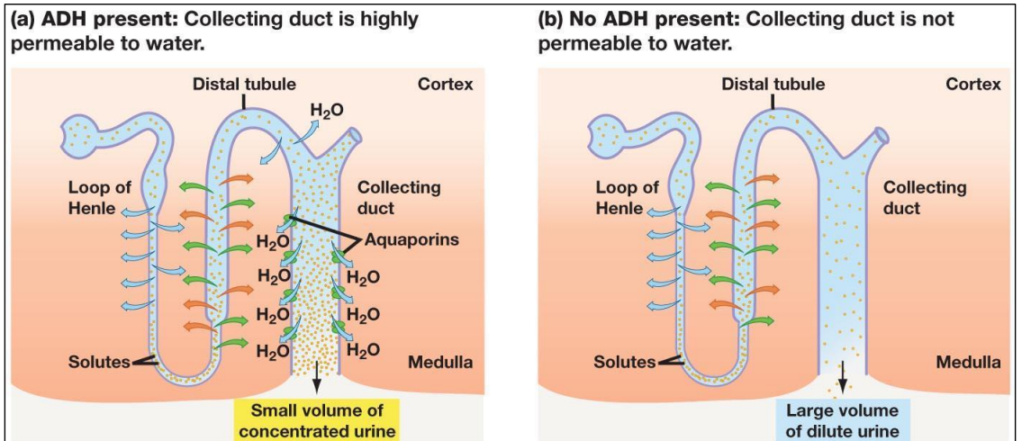 - With ADH, aquaporins move to the cell membrane, increasing water permeability → more water reabsorbed → concentrated urine.