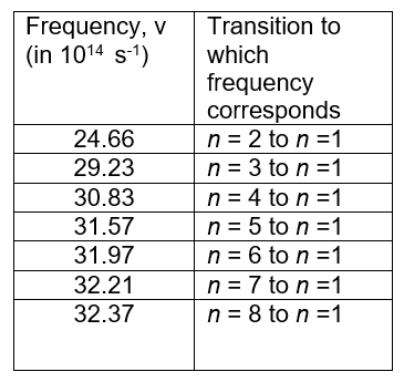 The frequencies in the table below are the frequencies of radiation emitted during electron transitions between different energy levels and n=1 or the ground state. These frequencies result in lines in the ultraviolet spectrum.