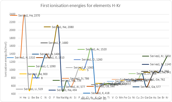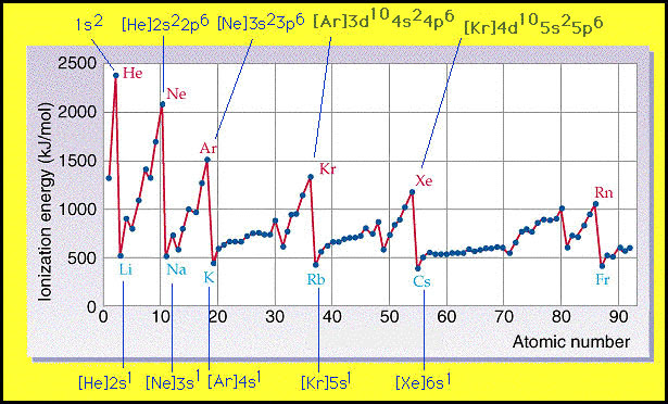 There is a repeated pattern (=periodic trend) of highest values for noble gases followed by a large drop for alkali metals. Peaks of noble gases/troughs of alkali metals also get lower as atomic number increases. | Existence for main energy levels: The large drop is caused by the most loosely held electron being on an energy level much further from nucleus. Peaks of noble gases/troughs of alkali metals also get lower as the most outer electron is on a higher main energy level – same periodic trend but at lower energy because the trend occurs at a higher energy level in the atom. |