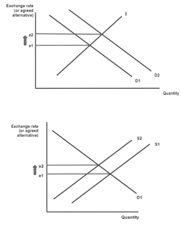 - Domestic firms competing from cheaper imports suffer – due to the current account surplus encouraging an appreciation (paragraph [1]).