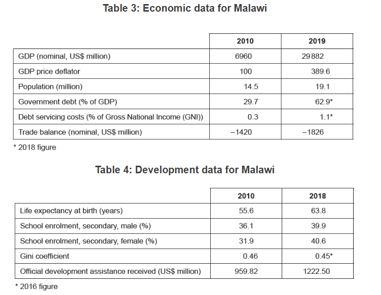 - Although 2019 was a difficult year due to drought, insect infestations, and a tropical cyclone, Malawi’s real gross domestic product (GDP) grew by 4.5 %. There is a large budget deficit and the amount of government debt (at approximately 60 % of GDP) is considered to be too high. Therefore, the government has announced plans to reduce its spending. Inflation had been forecast to increase to 14 % in 2020. Due to the planned contractionary fiscal policies, however, inflation may fall below 10 % from 2021 onwards.