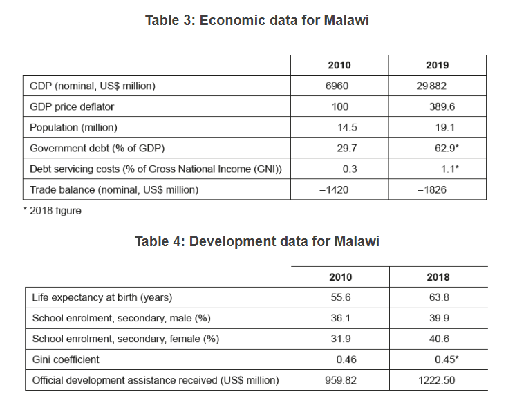 - Although 2019 was a difficult year due to drought, insect infestations, and a tropical cyclone, Malawi’s real gross domestic product (GDP) grew by 4.5 %. There is a large budget deficit and the amount of government debt (at approximately 60 % of GDP) is considered to be too high. Therefore, the government has announced plans to reduce its spending. Inflation had been forecast to increase to 14 % in 2020. Due to the planned contractionary fiscal policies, however, inflation may fall below 10 % from 2021 onwards.