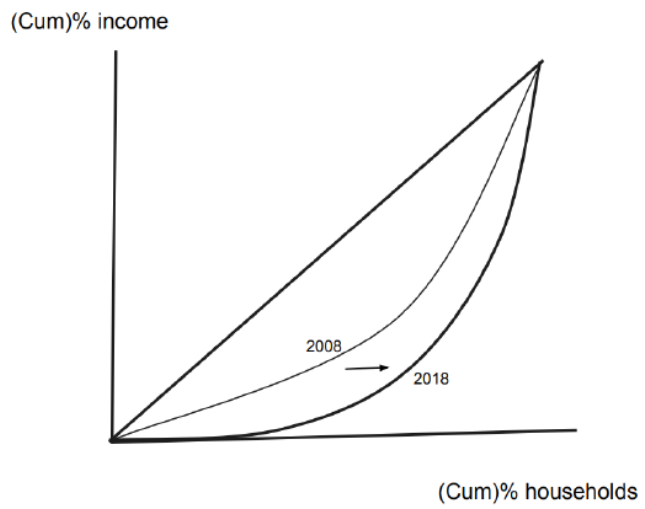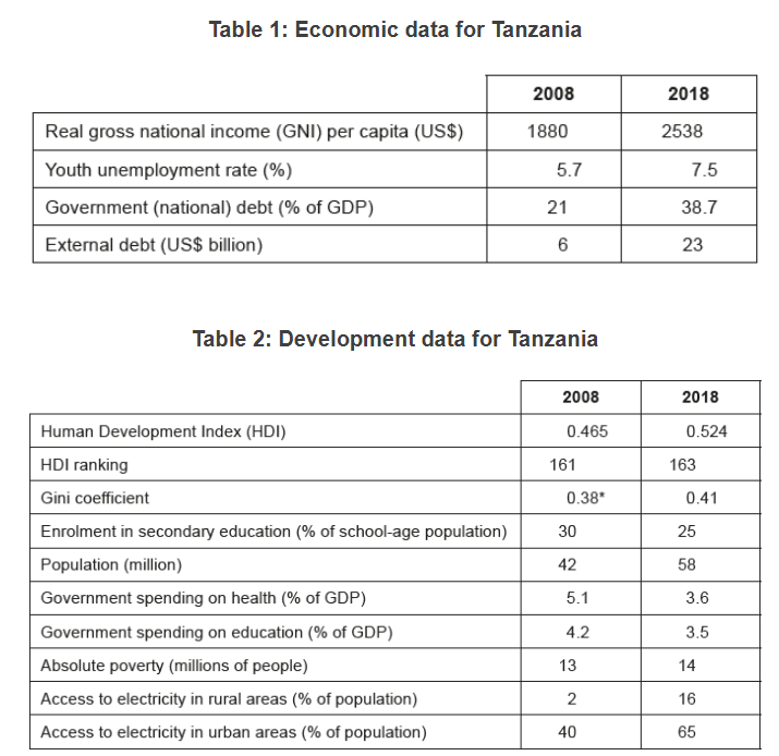 Sketch a Lorenz curve diagram to show the change in Tanzania’s Gini coefficient from 2008 to 2018 (Table 2).