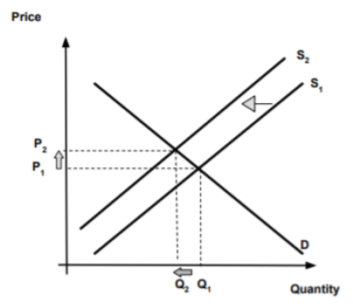 For drawing a correctly labelled demand and supply diagram for processed food that shows a decrease in supply (shift the left), and an increase in equilibrium price and decrease in equilibrium quantity.