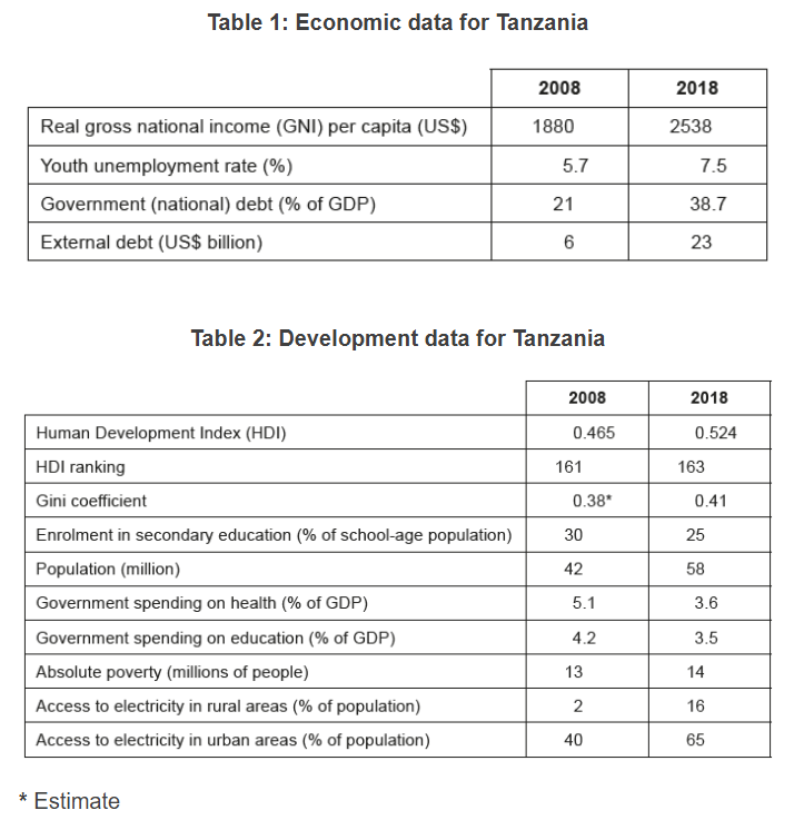 - Tanzania’s cities have experienced a growing middle class with strong purchasing power and political influence who have placed demands on the government for cheaper electricity, better infrastructure, and more imported goods. In response, the government provided subsidies for electricity in city centres and tax benefits to foreign companies operating in Tanzania. There is concern that these measures may worsen inequality and lead to social unrest.