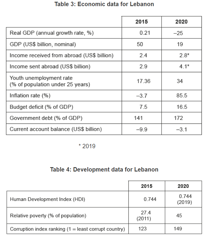 - Lebanon currently has a managed exchange rate system with the Lebanese pound (Lebanon’s currency) linked to the US dollar (US$). However, the government is finding it difficult to maintain the exchange rate at the desired level due to insufficient reserve assets. Recent falling remittances, low levels of exports and lack of foreign direct investment (FDI) are placing downward pressure on the Lebanese pound. Lebanon has limited natural resources and a small manufacturing industry, thus relies heavily on imports. As a consequence, the gradual depreciation of the Lebanese pound has led to cost-push inflation.