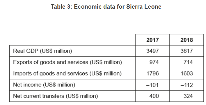 Using the information in Table 3, calculate the change in Sierra Leone’s current account balance from 2017 to 2018.