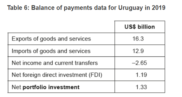 - To help the economy adjust to external shocks and to avoid large fluctuations in the exchange rate of the peso (Uruguay’s currency), the central bank uses its plentiful reserve assets of foreign currencies. In 2019, the decline in agricultural export revenues put downward pressure on the peso exchange rate. However, the central bank was able to prevent a large depreciation by using its reserve assets in the foreign exchange market.