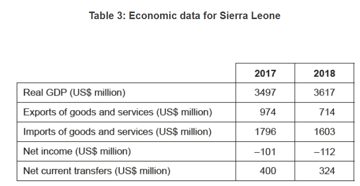 - The fall in export revenue has led to a 50 % depreciation of the leone (Sierra Leone’s currency) over the past five years. Even recent increases in the price of commodities have not been sufficient to offset the high import expenditure on food, medication, cars and capital equipment.