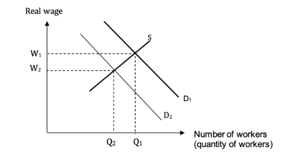 For drawing a labour market diagram with demand for labour shifting to the left and a reduction in the number of workers AND for explaining that the (permanent) loss in demand for workers with specific skills (manufacturing sector) leading to workers losing their jobs (due to a lack of demand for their skills).