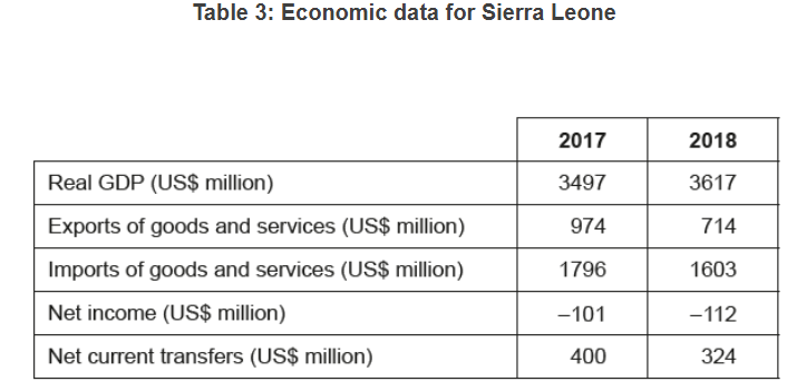 - The fall in export revenue has led to a 50 % depreciation of the leone (Sierra Leone’s currency) over the past five years. Even recent increases in the price of commodities have not been sufficient to offset the high import expenditure on food, medication, cars and capital equipment.