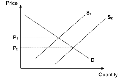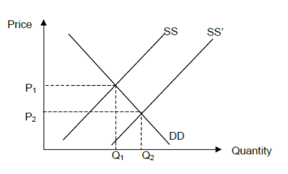 For a demand and supply diagram showing a shift of the supply curve to the right and a fall in price AND an explanation that government subsidies may help reduce (the farmers’) cost of production and hence lead to greater supply and lower prices.