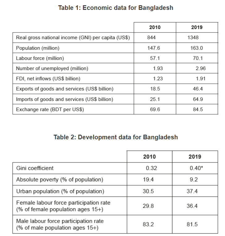 - Bangladesh is a densely populated country in Asia. Its currency is the Bangladeshi taka (BDT). The annual rate of growth of gross domestic product (GDP) has steadily increased from 5.6% in 2010 to 8.1% in 2019. Absolute poverty has declined, but inequality has risen, partly due to higher unemployment rates for women than men. Moreover, the labour force participation rate for women is much lower than the rate for men. Over 80% of the women’s jobs are in the informal economy, and these jobs are low paid and insecure. Women need regular paid work, which not only raises household income but also improves economic well-being in terms of education and health.
