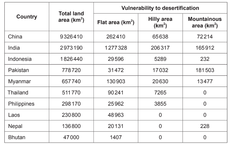 The table shows the vulnerability to desertification of selected countries in Asia.