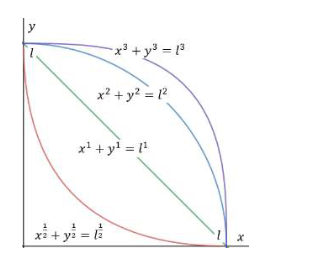 (d) (i) On the same set of axes, in the first quadrant, sketch and label $x^n+y^n=l^n$ for $n=\frac{1}{2}, 1,2,3$.