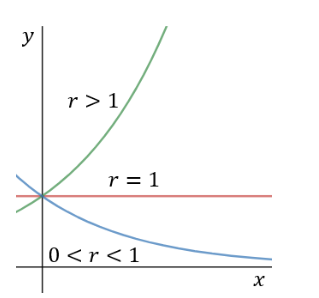 (b) (i) Sketch graphs of $y=u_1 r^{x-1}$ for $x>0$, for the cases $r>1, r=1$ and $0<1<r$.