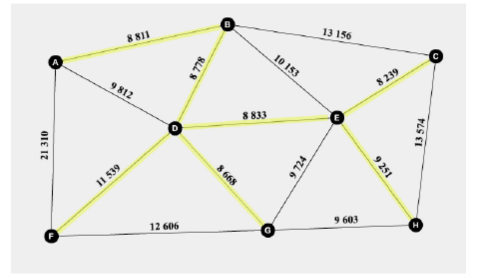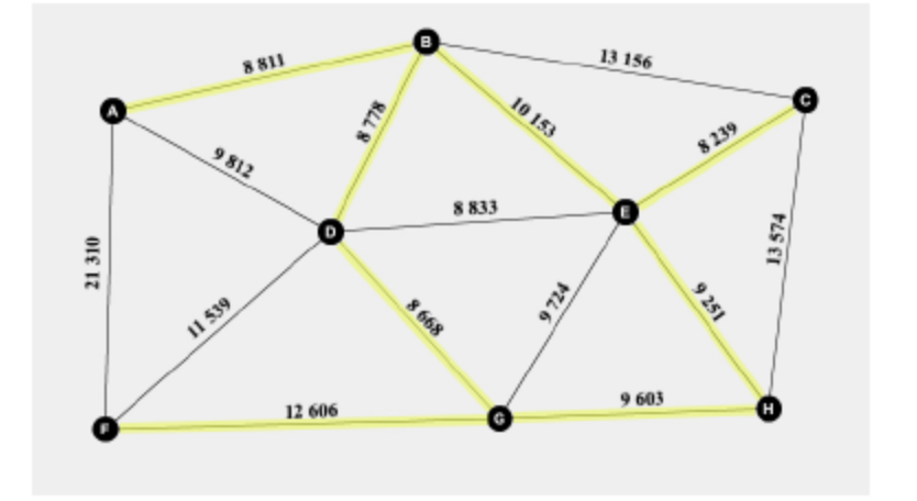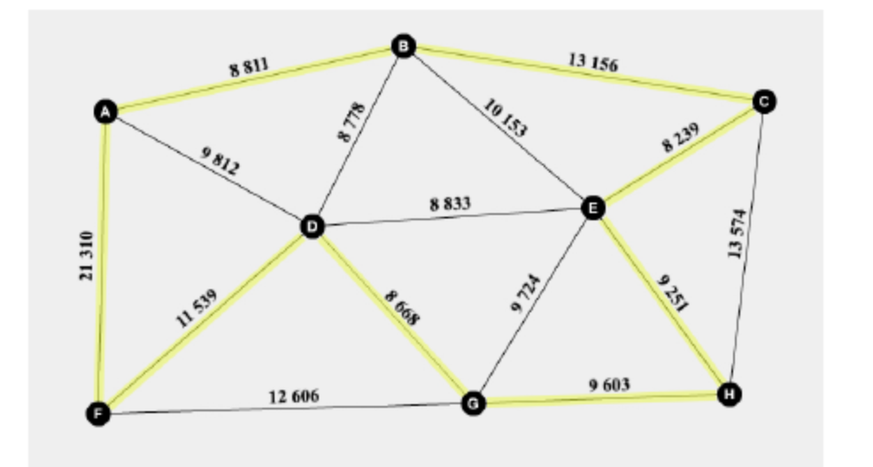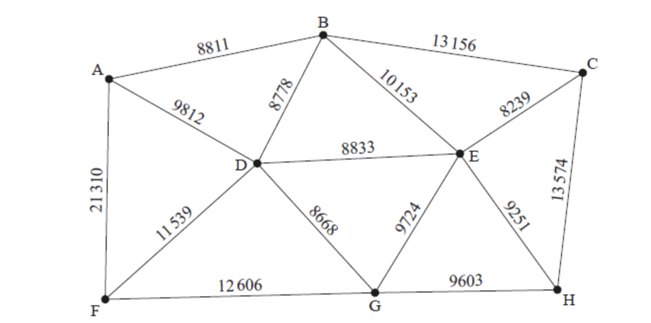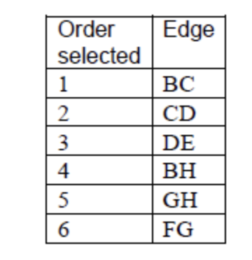 b.i.Use Prim’s algorithm, starting at vertex B, to find the weight of the minimum spanning tree of the remaining graph. You should indicate clearly the order in which the algorithm selects each edge.
