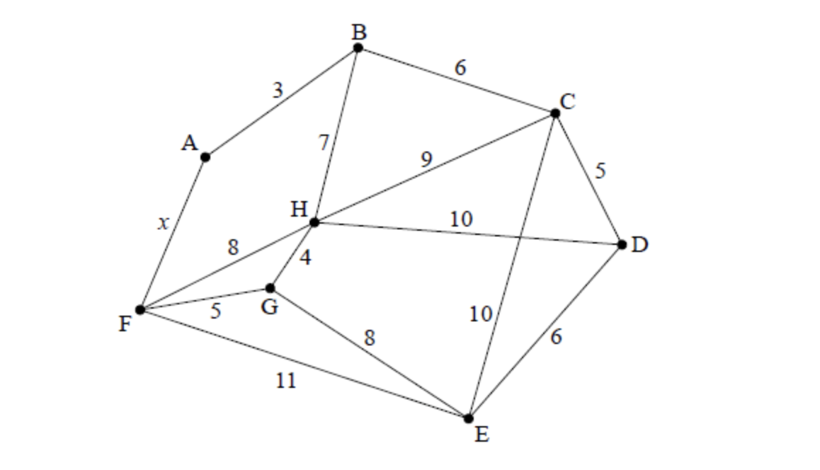 Graph $W$ is shown in the following diagram. The vertices of $W$ represent tourist attractions in a city. The weight of each edge represents the travel time, to the nearest minute, between two attractions. The route between A and F is currently being resurfaced and this has led to a variable travel time. For this reason, $\mathrm{AF}$ has an unknown travel time $x$ minutes, where $x \in \mathbb{Z}^{+}$.
