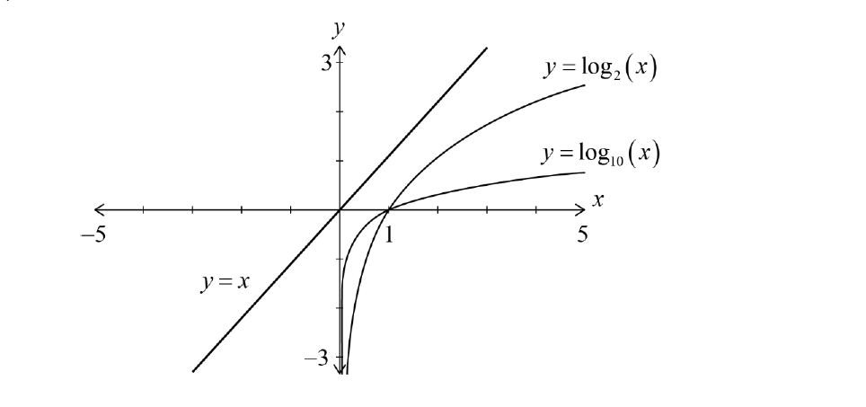 Correct shapes: \( y = \log_2 x \) and \( y = \log_{10} x \) are increasing, concave downward with vertical asymptote at \( x = 0 \); \( y = x \) is a straight line with slope 1: (A1)