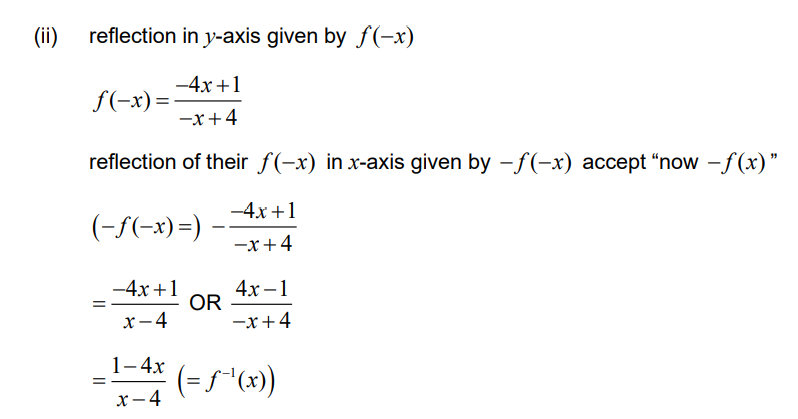 (i) \( f^{-1}(x) = \frac{1 – 4x}{x – 4} \) (M1A1A1A1, N3).