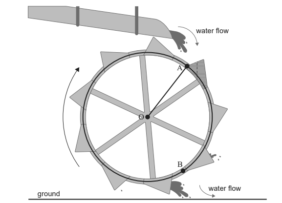 The following diagram shows a water wheel with center O and radius 10 meters. Water flows into buckets, turning the wheel clockwise at a constant speed.