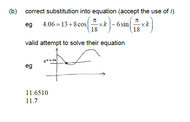 Set \(h(t) = 4.06\): \(13 + 8 \cos\left(\frac{\pi}{18}t\right) – 6 \sin\left(\frac{\pi}{18}t\right) = 4.06\) (M1).