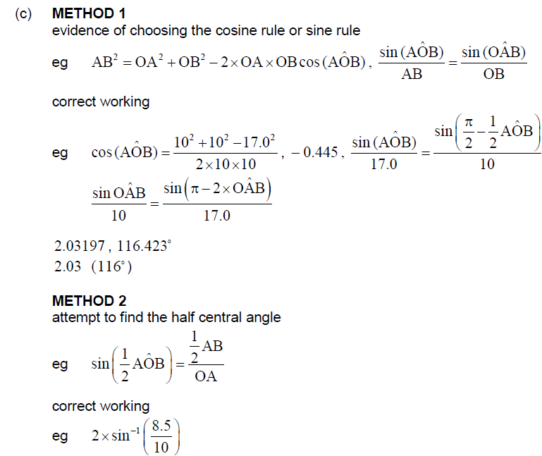Using \(\cos\left(\frac{\hat{AOB}}{2}\right) = \frac{10^2 + 10^2 – 17^2}{2 \times 10 \times 10}\), \(\cos\left(\frac{\hat{AOB}}{2}\right) = \frac{200 – 289}{200} = -0.445\) (M1).