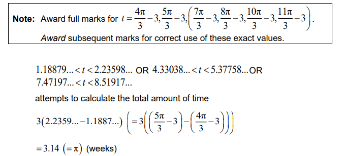 Use amplitude form: \(R \cos\left(\frac{\pi}{18}t – \phi\right)\), where \(R = \sqrt{8^2 + (-6)^2} = 10\), \(\tan \phi = \frac{-6}{8} = -0.75\), \(\phi \approx 2.5536\) (A1).