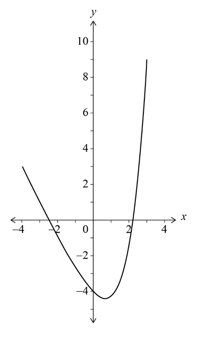 (a) Sketch of \(y=e^x-2x-5\) on \([-4,3]\)