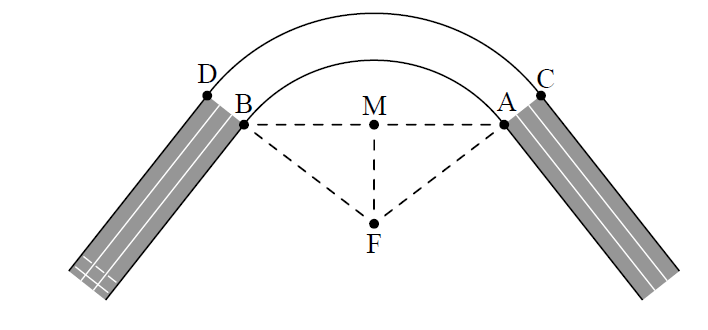 The outer boundary of the trail, from C to D, also traces a circular arc with center F, maintaining a trail width of 2 metres.