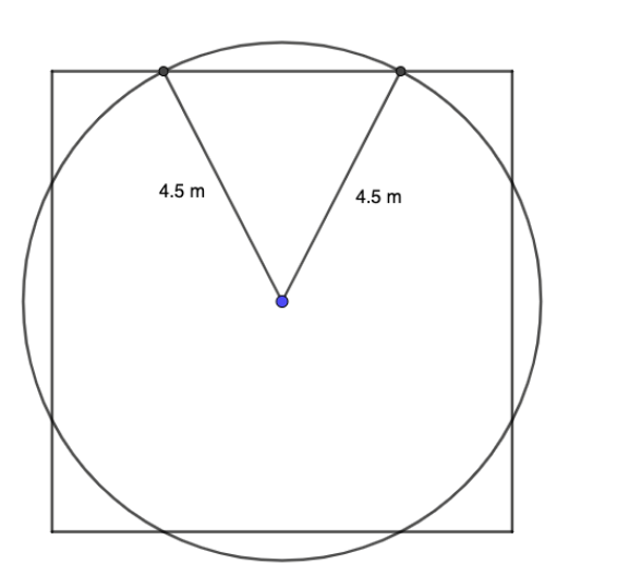 A square field with side 8m has a goat tied to a post in the center by a rope such that the goat can reach all parts of the field up to 4.5m from the post.