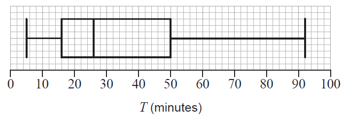 (h) From the boxplot, \(Q_1=16\), \(Q_3=50\). So \(\text{IQR}=Q_3-Q_1=50-16=\boxed{34\ \text{minutes}}\). [2]