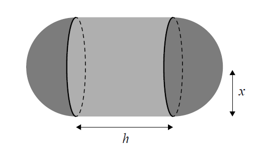 The solid shown in the following diagram is comprised of a cylinder and two hemispheres. The cylinder has height \(h\) cm and radius \(x\) cm. The hemispheres fit exactly onto either end of the cylinder.