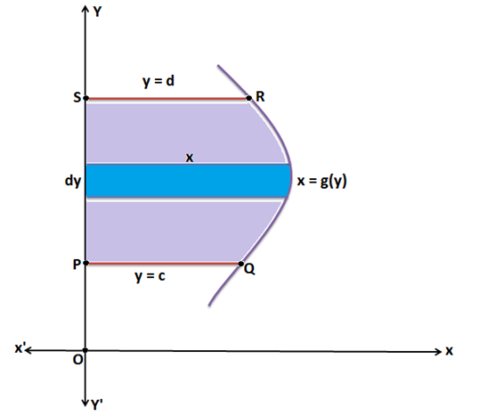In some cases, the curve is better expressed as \( x = g(y) \). If the region is bounded by the curve, the y-axis \( (x = 0) \), and horizontal lines \( y = c \) and \( y = d \), where \( c < d \), the area is found by integrating with respect to \( y \):
