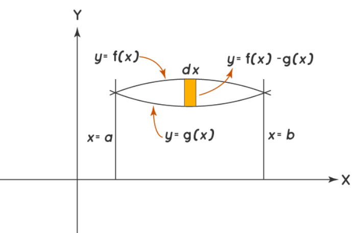 $ \boxed{\text{Area} = \int_a^b \left[ f(x) – g(x) \right] \, dx }$