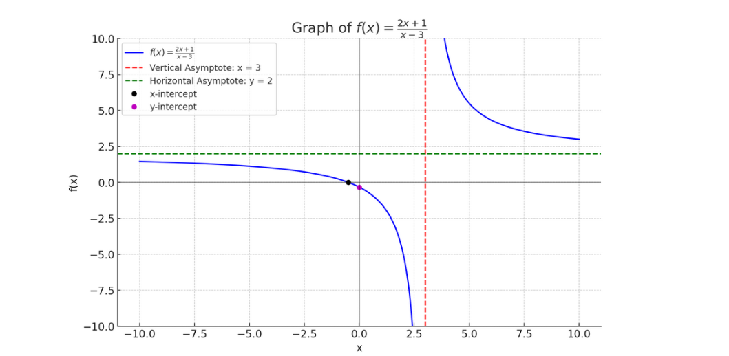 Example: Sketch the graph of \( f(x) = \frac{2x + 1}{x – 3} \)