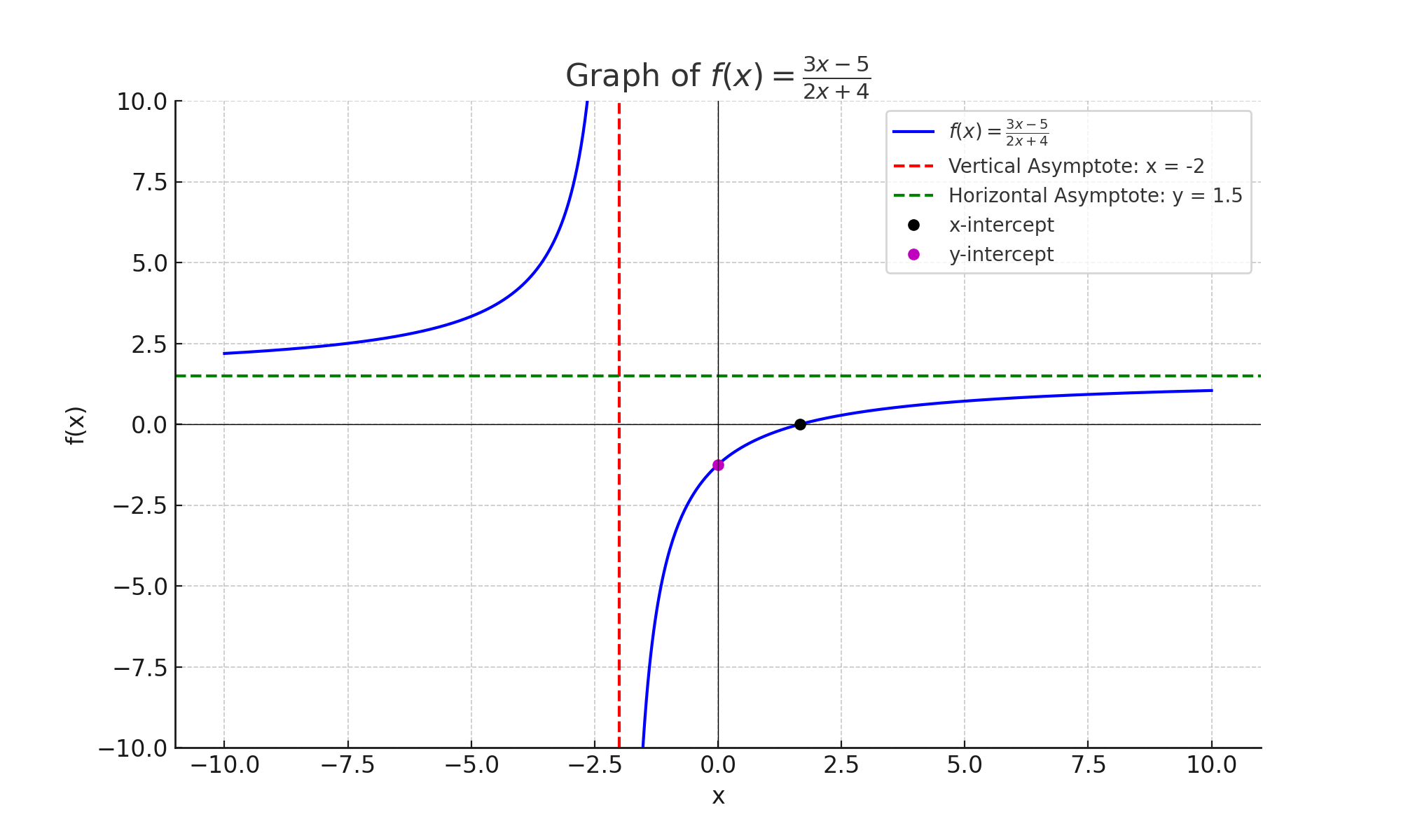 Example: Find the vertical and horizontal asymptotes of \( f(x) = \frac{3x – 5}{2x + 4} \).