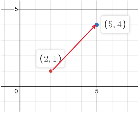 Example Draw a vector \(\vec{AB}\) from point \(A(2, 1)\) to point \(B(5, 4)\). ▶️ Answer/ExplanationSolution: