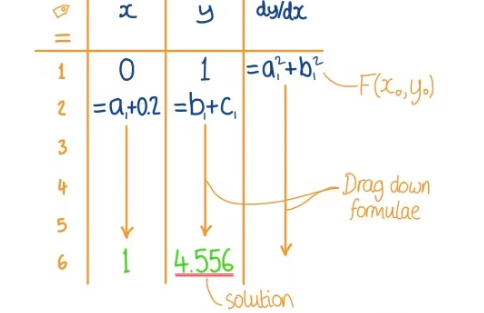 Example Given \( \frac{dy}{dx} = x^2 + y^2 \), and initial point \( (0, 1) \), use a step size of 0.2 to estimate \( y \) when \( x = 1 \) using Euler’s Method. ▶️Answer/ExplanationManual Calculation (Euler’s Method):