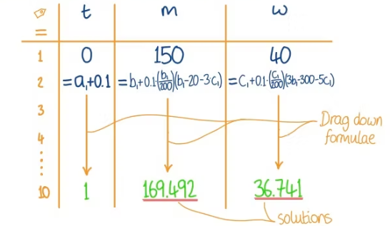 Example The population of moose \( m \) and wolves \( w \) on an island, after \( t \) years, is modeled by the coupled system: $ \frac{dm}{dt} = \frac{1}{200} m (150 – 20 – 3w), \quad \frac{dw}{dt} = \frac{1}{200} w (3m – 300 – 5w) $ Initially, there are 150 moose and 40 wolves. Using a step length of \( h = 0.1 \), estimate the population of moose and wolves after 1 year. ▶️Answer/ExplanationManual Step (Euler’s Method): Let \( m_0 = 150 \), \( w_0 = 40 \) $ \frac{dm}{dt} = \frac{150}{200}(150 – 20 – 3(40)) = \frac{3}{4}(40) = 30 \Rightarrow m_1 = 150 + 0.1 \cdot 7.5 = 150.75$ $\frac{dw}{dt} = \frac{40}{200}(3(150) – 300 – 5(40)) = \frac{1}{5}(-50) = -10 \Rightarrow w_1 = 40 + 0.1(-10) = 39 $ So after \( \frac{1}{10} \) of a year, the populations are approximately \( m = 150.75 \), \( w = 39 \). Using GDC (TI-nspire Lists & Spreadsheets):