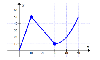 Example Peter investigated a series of data \((x,y)\) and observed that: between \(x=0\) and \(x=10\), \(y\) is proportional to \(x\) i.e. data follow a model of the form \(ax\) between \(x=10\) and \(x=30\), \(y\) decreases linearly in rate 2 i.e. data follow a model of the form \(-2x+b\) between \(x=30\) and \(x=50\), data follow the quadratic model \(0.1(x-30)^2 + 10\), (a) Write down a piecewise function \(f(x)\) that describes the data. ▶️Answer/ExplanationSolution: $ f(x) = (b) At \(x=10\): \(ax = -2x + b \implies 10a = -20 + b\) The solution of the system is \(b = 70\) and \(a = 5\). Thus, \(f(x)\) takes the form: $ f(x) = (c)