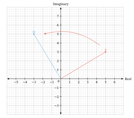 Example Consider the complex number $z = 5 + 3i$. If $iz$ is represented on an Argand diagram by the point $A$, in which quadrant of the Argand plane does $A$ lie? Sketch it on Argand plane. ▶️Answer/ExplanationSolution: $ Now, on an Argand diagram, a complex number $a + bi$ is represented by the point $(a, b)$. So: $z = 5 + 3i$ corresponds to the point $(5, 3)$ Thus, the point $A$, which represents $iz$, lies in the second quadrant (where real part is negative and imaginary part is positive).