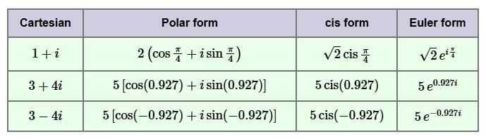 - Modulus–argument (polar) form: