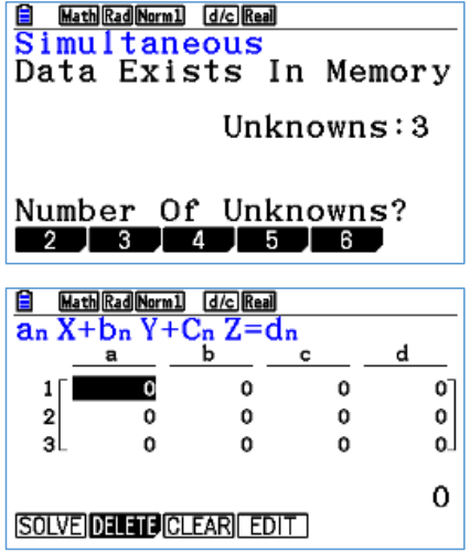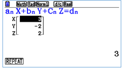 Example(USING GDC) Find \( X, Y, Z \) for $\begin{align*} 5x + y – 4z &= 5 \\ 2x – 3y – 5z &= 2 \\ 7x + 2y – 6z &= 5 \end{align*}$ ▶️Answer/ExplanationSolution: $\begin{align*} 5x + y – 4z &= 5 \\ 2x – 3y – 5z &= 2 \\ 7x + 2y – 6z &= 5 \end{align*}$ So, in the next screen, after pressing q, I choose w (3) This screen shows the type of equation and the number of variables.