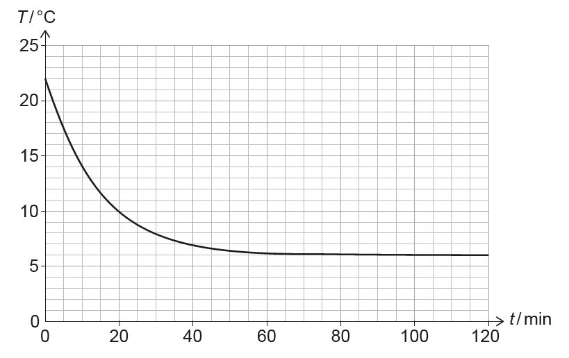 At \(t=0\): \(T_1 = 22^\circ C = 295\,K\). At \(t=120\,min\): \(T_2 = 6^\circ C = 279\,K\).