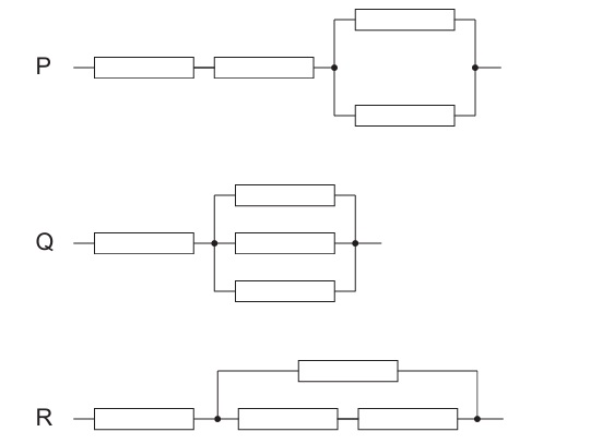 Order of increasing resistance: P (R/4) → Q (R) = R (R) → but since Q and R have equal resistance, the order depends on specific arrangement. Given the answer is D (Q R P), this suggests: